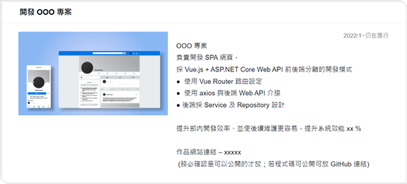 強調專案中的經驗及成就 & 完整展現作品、技術能力及學習能力 #善用【專案成就】 |